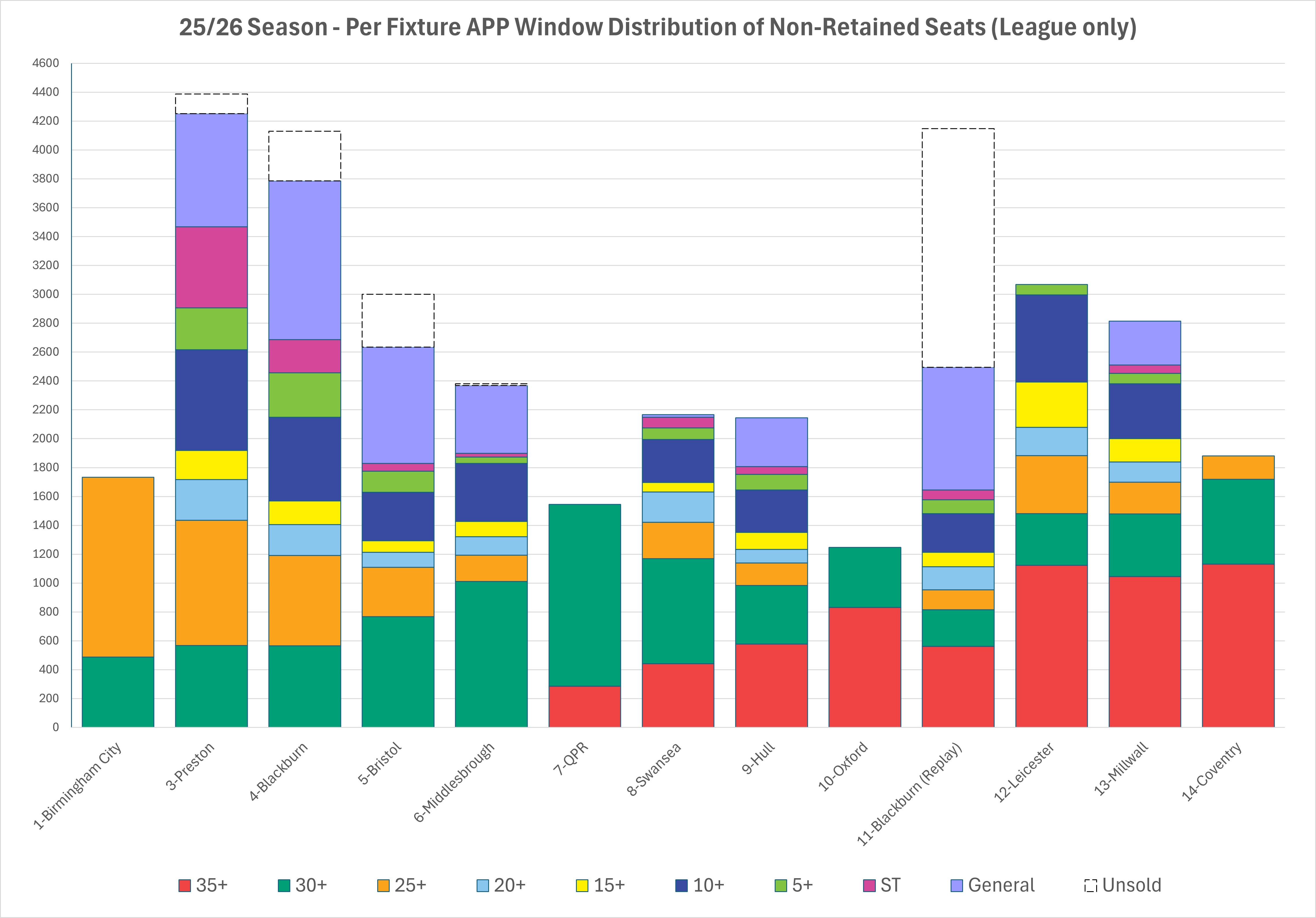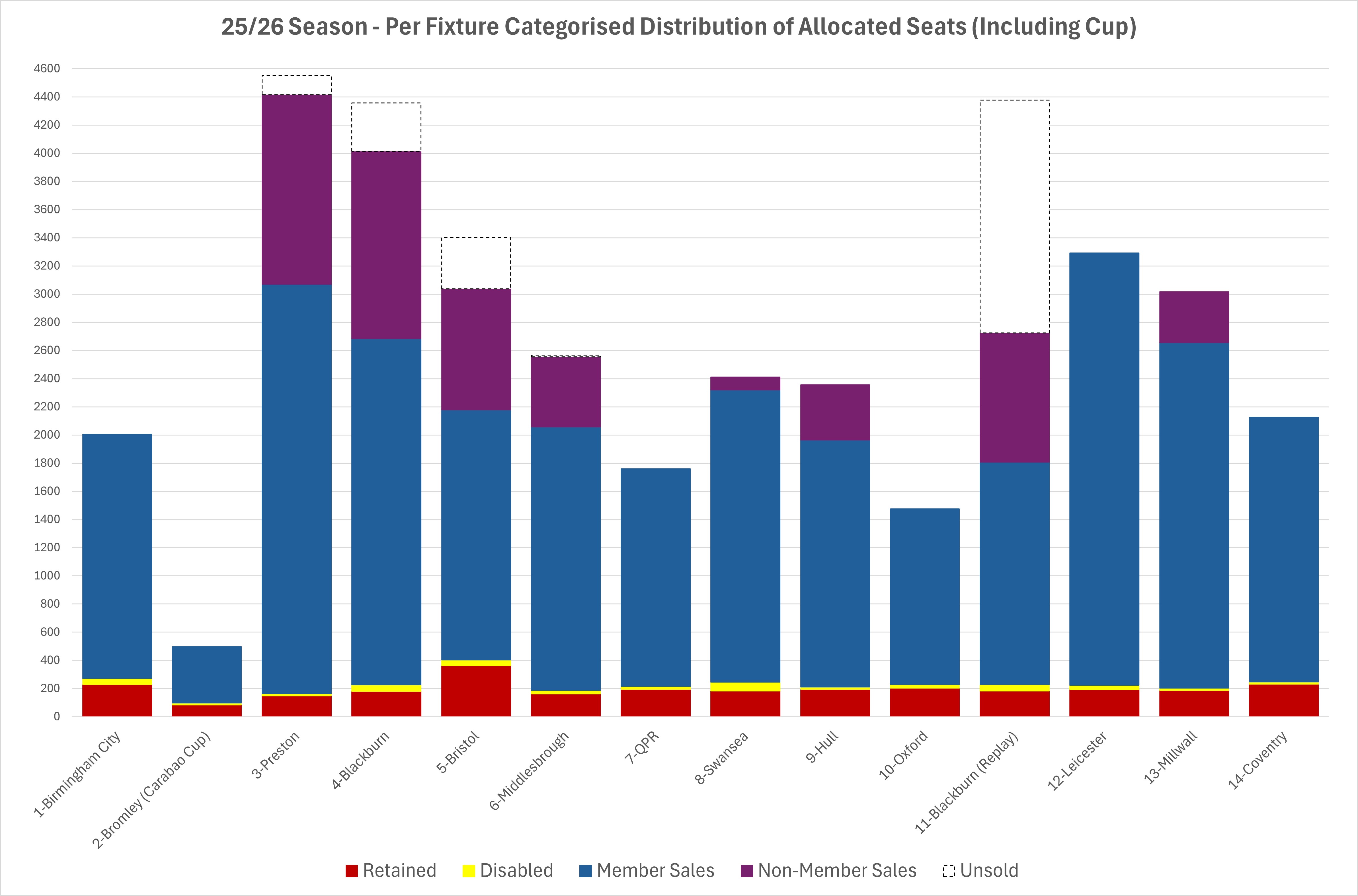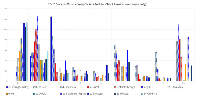 | 25/26 Coventry City Away Match Sales 'Profile' 12:51 - Nov 26 with 1025 views | tommcd | The Coventry fixture sold out in the 25+ Window (Weds). The sales profile for the fixture therefore follows. Summary: The Club announced an allocation of 2127 tickets had been provided, the seatmap count matched that. - The Club retained a total of 231 seats for Club allocation and steward use (aproximately 50 of those for Ballot distribution). - There were 16 wheelchair / assistant seats. - A total of 1880 tickets were made available for purchase for across Member Sales. All blocks were made available from the beginning of the sale. Per Window Sales: - 1131 (60.16% of available seats) seats sold in the 35+ window. - 589 (31.33%) seats sold in the 30+ window - 160 (8.51%) seats sold in the 25+ window Points of Note: * A greatly reduced allocation for this fixture compared to previous seasons. * The fixture is at a strange time, 6pm on what will be for many, a working day. * No growth in the 35+ window for this fixtures suggests maybe some highest pointers are skipping this due to the awkward time. * A fairly large increase in the 30+ window, probably the affect of upward window-migration, but obscured 'til thhis sale due to the oddity of the Millwall sale (poor transport on boxing day, conflicting festive commitments, etc). Graphical Comparison: Includes Blackburn (Replay) Sales to date. Previous Sales 'Profiles' for reference: * Birmingham City - https://www.twtd.co.uk/forum/610338 * Bromley (Carabao Cup) - https://www.twtd.co.uk/forum/610667 * Preston - https://www.twtd.co.uk/forum/612980 * Blackburn - https://www.twtd.co.uk/forum/615106 * Bristol City - https://www.twtd.co.uk/forum/615744 * Middlesbrough - https://www.twtd.co.uk/forum/615574 * QPR - https://www.twtd.co.uk/forum/616538 * Swansea - https://www.twtd.co.uk/forum/616808 * Hull - https://www.twtd.co.uk/forum/617990 * Oxford - https://www.twtd.co.uk/forum/617847 * Blackburn (Replay) - TBC; still onsale. * Leicester - https://www.twtd.co.uk/forum/618888 * Millwall - https://www.twtd.co.uk/forum/619573 |  | | |  |