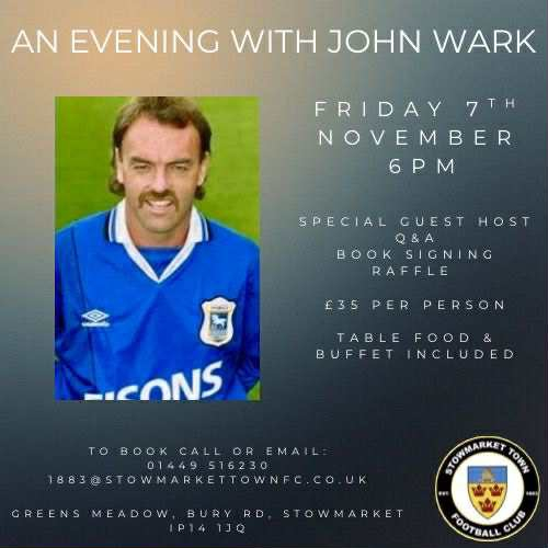 Evening With Wark at Stowmarket Friday, 24th Oct 2025 10:04 Blues legend John Wark is staging an ‘Evening With’ event at Stowmarket Town on Friday 7th November. Wark will be joined by a special guest host for a question and answer session, while there will be a book signing and raffle. Tickets are £35, including table food and buffet, and are available from 1883@stowmarkettownfc.co.uk, 01449 516230. Thurlow Nunn Premier Division Stowmarket are currently in a perilous financial situation, their current directors having inherited debts of more than £100,000 from the previous administration. The club is raising funds through a GoFundMe page. ![]() The recently published book, He’s Here, He’s There - Ipswich Town Football Club – The John Wark Era – 1973 – 1996, is available now via TWTD here. There are two versions of He’s Here, He’s There , a collector’s edition limited to 857 copies, representing Wark’s 678 Town appearances and 179 goals, and the standard edition. ![]()